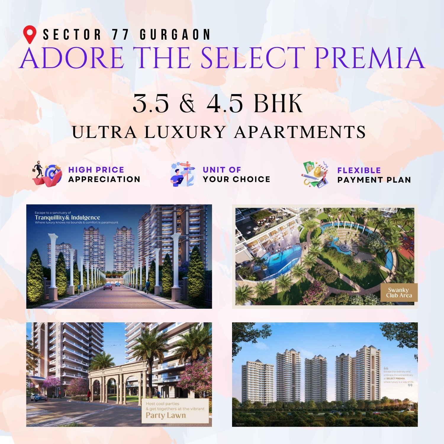 Experience luxurious living with 3, 3.5, and 4.5 BHK apartments at Adore Select Premia, Sector 77, Gurugram. This project seamlessly blends luxury, nature, and world-class amenities, surrounded by lush green spaces and exquisite architectural designs.